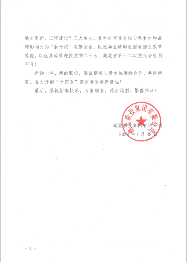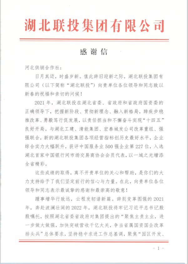 湖北聯(lián)投集團(tuán)向省供銷社致感謝信