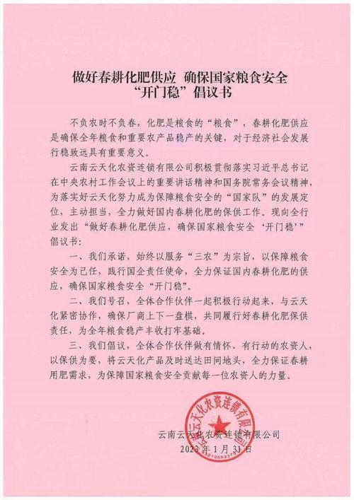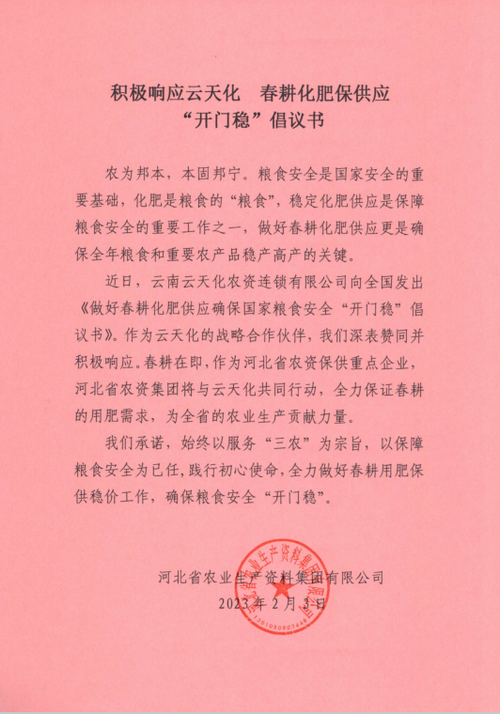 近日,云南云天化農(nóng)資連鎖有限公司向全國發(fā)出《做好春耕化肥供應(yīng)確保國家糧食安全“開門穩(wěn)”倡議書》。作為云天化的戰(zhàn)略合作伙伴,我們深表贊同并積極響應(yīng)。春耕在即,作為河北省農(nóng)資保供重點(diǎn)企業(yè),河北省農(nóng)資集團(tuán)將與云天化共同行動(dòng),全力保證春耕的用肥需求,為全省的農(nóng)業(yè)生產(chǎn)貢獻(xiàn)力量。